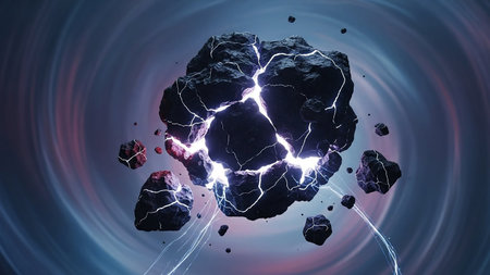 A dark, exploding asteroid with bright white energy bursts and debris in a cosmic swirl.