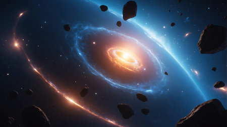Vibrant cosmic scene with asteroids against a colorful backdrop.