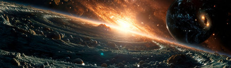 Explosive cosmic collision of asteroids in deep space with planets and glowing energy bursts.