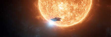 An intense, captivating space scene of a spaceship flying through an asteroid belt, bathed in supernova light ideal for space adventure games or narratives