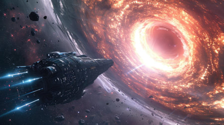 Futuristic spacecraft flying toward black hole in cosmos. 3d render