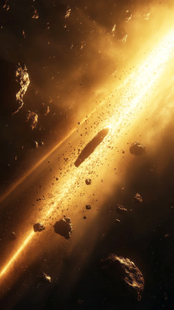 A stunning depiction of an explosive cosmic event lighting up the dark universe, surrounded by fragmented asteroids and vivid celestial bodies, showcasing the beauty and mystery of space.