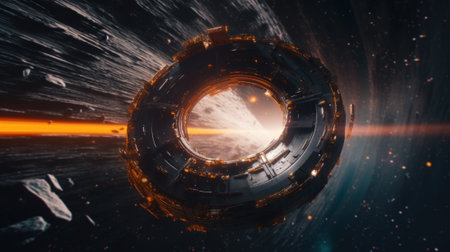 A futuristic spaceship traveling through a glowing wormhole, bending light into colorful spirals of energy.