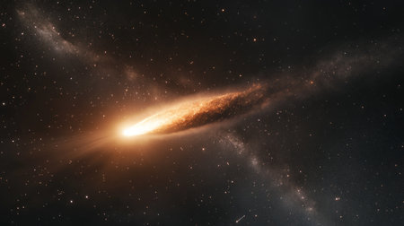 bright comet with a fiery tail crossing a dark sky full of constellations, leaving a trail of bright dust generative ai
