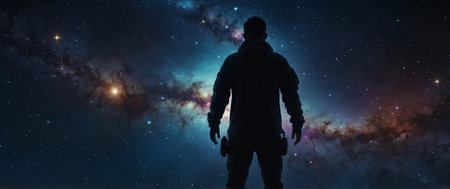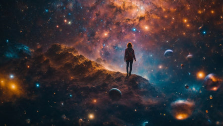 Beautiful fantasy cosmic background. Human figure watching planets, nebulas, galaxies and stars. Abstract exploration, star travel, and advance civilization concept. Copy space.