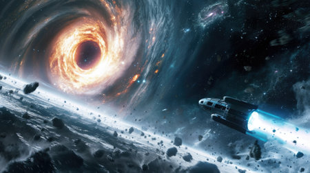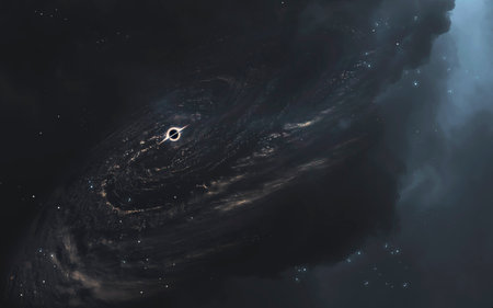 Black hole absorbing light in deep space. 5K realistic science fiction art.