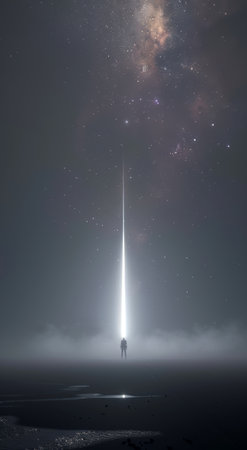 In an expansive, empty environment, a figure is bathed in a striking beam of light reaching towards the stars, creating an ethereal atmosphere.