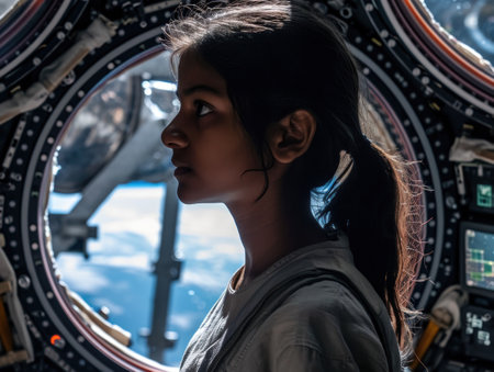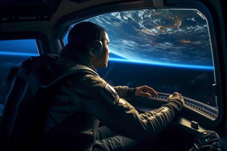 Generative AI illustration of astronaut in a spaceship looking out the window at planet Earth. space research