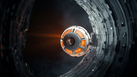 A white and orange spherical spacecraft cruises through the interstellar space, featuring a beautiful composition and cinematic aesthetics