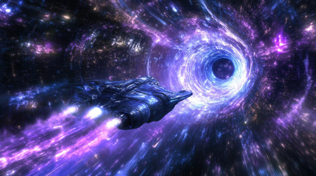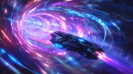 A futuristic spaceship traveling through a glowing wormhole, bending light into colorful spirals of energy.