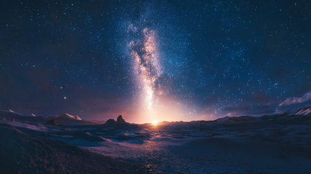 As twilight descends, the Milky Way stretches across the night sky, casting a magical glow over the tranquil landscape and highlighting distant mountain silhouettes against a star-studded backdrop.