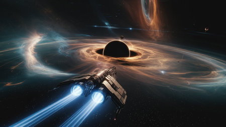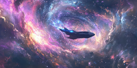 A stunning digital illustration of a spacecraft entering a vibrant cosmic wormhole, with colorful stars and galaxies, showcasing the mysteries of interstellar travel and potential adventures beyond known space.
