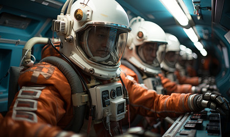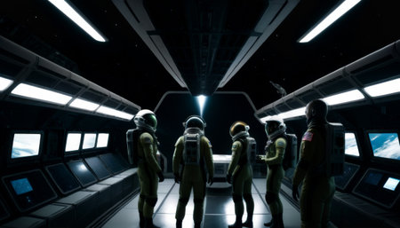A team of astronauts clad in green and white suits gazes into deep space from a ships observation deck, a sense of exploration and discovery palpable.. AI Generation