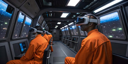 Crew members in orange space suits engage with virtual reality gear inside a futuristic shuttle, simulating an interstellar journey while exploring distant galaxies.