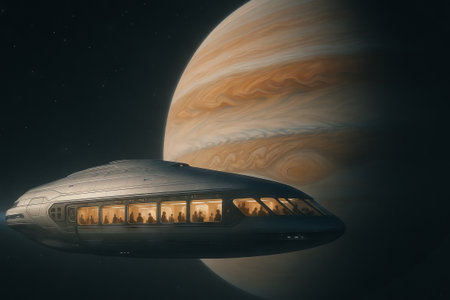 Futuristic space liner traveling near gas giant planet in cosmic scene illustration. concept of interstellar travel, advanced technology, space exploration.