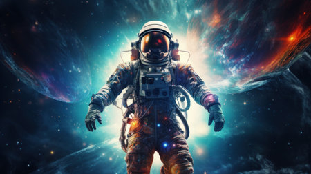 Vibrant astronaut in space, surrounded by cosmic wonders, offering ample copy space for text.