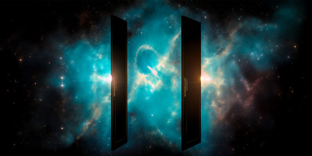 Mysterious and ethereal design with three doors emerging from the nebulae The light shines through the half-opened central door, creating an enchanting effect. Represents endless possibilities