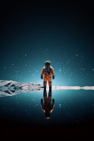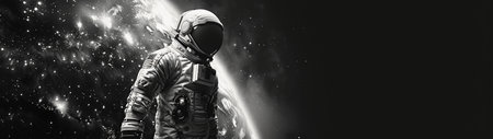This striking black and white image captures the essence of human exploration and solitude in the vastness of space. A lone astronaut, standing on the edge of an extraterrestrial surface, gazes out into the swirling dust and distant stars of the cosmos. The minimalist composition and monochrome palette emphasize the stark beauty and overwhelming scale of the universe, juxtaposing human presence against the endless frontier. This high-resolution photograph is perfectly suited for editorial use, scientific publications, inspirational content, or as a thought-provoking piece that explores the theme of isolation and discovery in the great unknown.