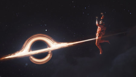 An astronaut floats in a dark space, near a large black hole. The scene showcases an artistic illustration with bright, contrasting colors and a swirling background. The composition suggests deep space exploration, suitable for use in educational materials or science-themed projects. The image evokes a sense of wonder and the unknown.