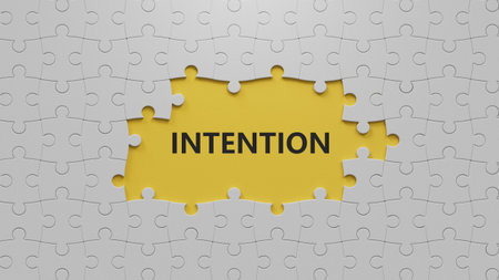 The white puzzle pieces with missing pieces with text INTENTION. financial market. financing.close up of The white puzzle pieces with missing pieces,Business Concept.3D rendering on yellow background.