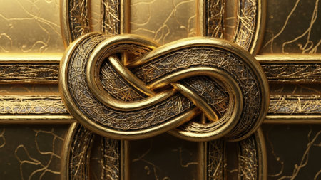 A macro close-up of an intricate golden rope knot, displaying a complex woven pattern with a metallic sheen. The detailed texture symbolizes strength, infinity, and skilled craftsmanship.