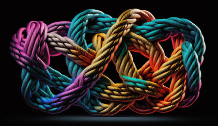 Intertwined ropes of diverse colors symbolize unity and synergy in teamwork, forming a strong, cohesive bond.