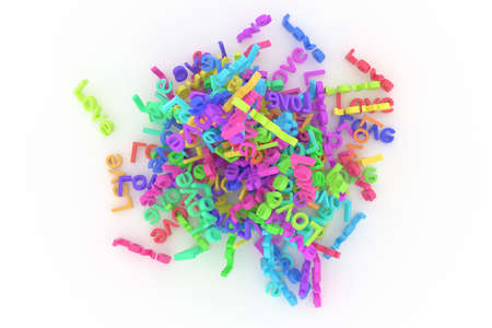 Decorative, illustrations CGI typography, love, bunch of word. Good for design texture, background. Colorful 3D rendering.