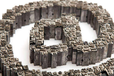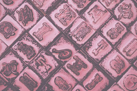 Letterpress background, close up of many old, random metal letters with copy space