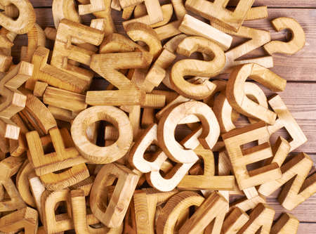 Heap of wooden letters are lying on the wooden board