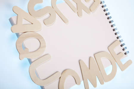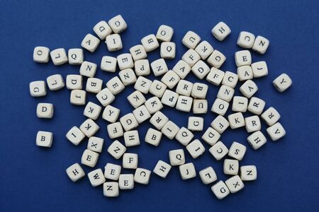 Wooden alphabet letters on blue paper background. A lot of wooden letters with copy space.