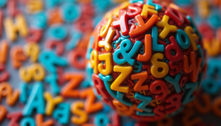 A vibrant sphere made of multicolored letters and symbols stands out against a chaotic backdrop of scattered letters. This playful composition evokes a sense of creativity and fun, perfect for educational themes or childrens activities.
