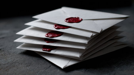 A stack of envelopes with wax seals on them. The envelopes are white and have red wax on them