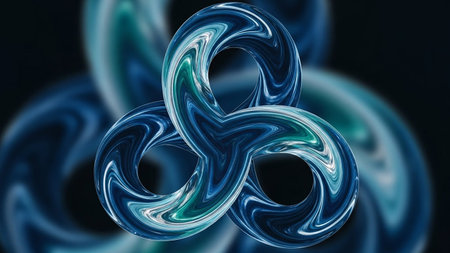 Abstract swirling blue and teal colors form a trefoil knot shape with a dark background.