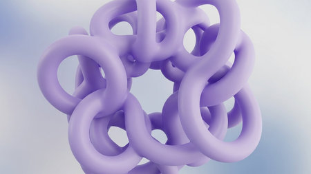 showing a complex interwoven knot of smooth glossy lavender torus shapes with a soft focus blurred purple background creating an abstract 3d...