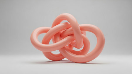 showing a complex knot formed by intertwined smooth glossy pink torus shapes on a light gray background. resolution
