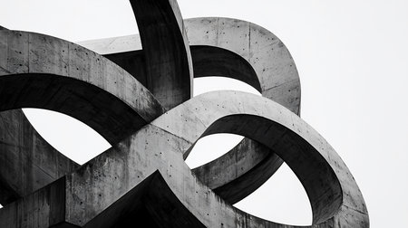 A striking black and white image of an abstract architectural sculpture featuring interwoven concrete arches against a bright sky, showcasing modern design and geometric complexity.