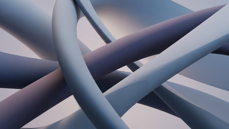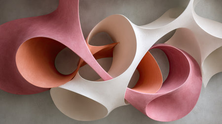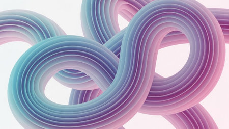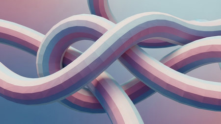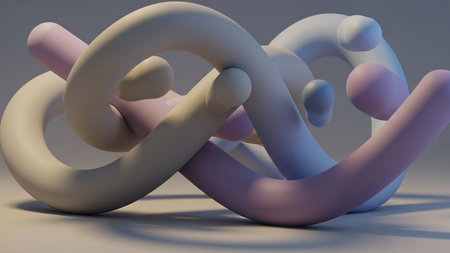 An abstract 3D sculpture formed by intertwined soft pastel colored tubes with gentle shadows and smooth rounded...