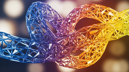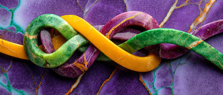 Close up of a bunch of colorful ribbons with intricate rainbow stripes intertwined, Intricate patterns of rainbow stripes intertwining and overlapping