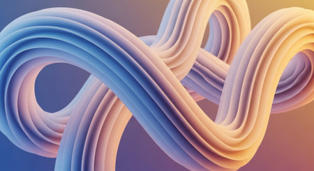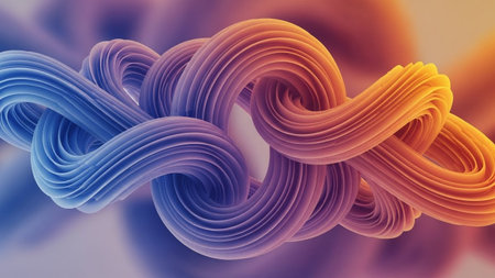 Smooth, intertwined ribbons of blue and orange create a fluid, abstract shape with soft gradient blending and gentle...