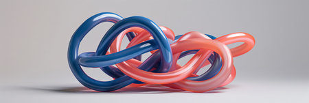 Photo of linked sapphire and vermilion rubber tubes artfully arranged against a plain backdrop, moment from everyday life, style 35mm, --ar 3 1 Job ID aacb7133-6534-4a47-97a7-aa2e04545417