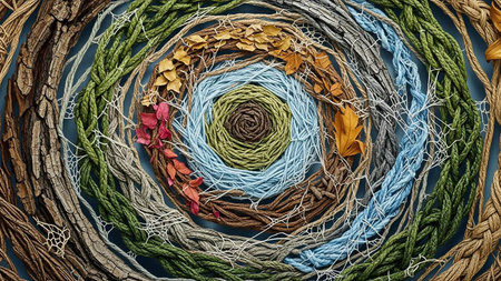 A close-up, top-down view of an abstract spiral created from various natural materials and yarn. The spiral begins with a dark brown center and expands outwards, incorporating textures of bark, braided grey and white twine, green and blue yarn, and small dried leaves in red, orange, and yellow. The intricate weaving and varied textures create a visually rich and organic pattern.