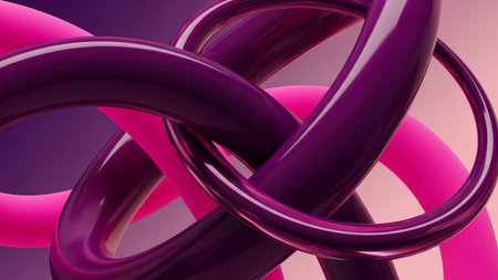 This abstract presents a close-up view of smooth, glowing neon pink tubes intricately knotted together. The tubes a polished surface that reflects the light, creating a sense of depth and volume. The vibrant pink contrasts with the deep, dark purple background, making the central knot the focal point. The lighting is soft yet intense, highlighting the curves and the complex interweaving of the tubes, suggesting a and modern
