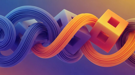 Intertwined abstract tubes of orange and blue weave around purple hollow cubes against a soft gradient background.