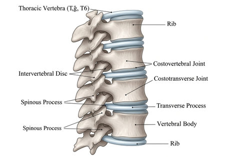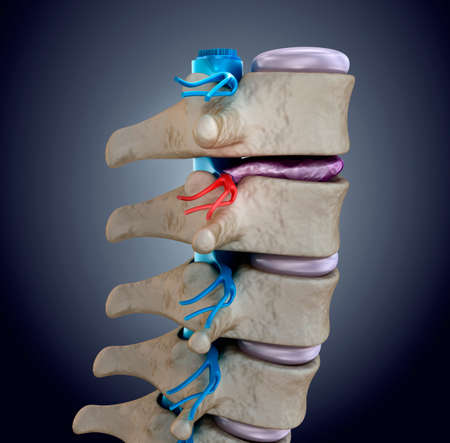 A close up of a human spine with a blue background.
