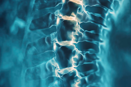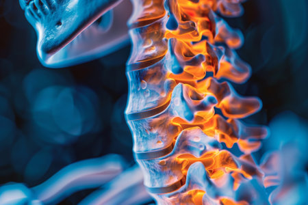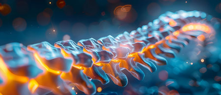 Spine illustration glowing with neural connections shows the intricate anatomy of the human spine with a futuristic style. Blue background highlights the detailed structure and flow.