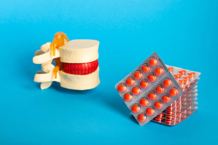 Many red pills in blisters against the background of a model of a human spine and a blue background. Concept of treating the spine with chondroprotector pills and homeopathy