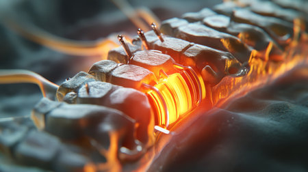 A glowing, orange-hot metal coil is surrounded by a cool, gray metal structure