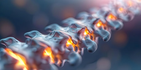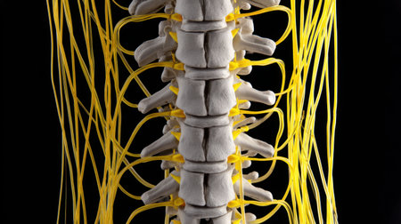 A close view of the human spine demonstrates intricate neural connections illuminated in a glowing effect. This visualization showcases the complexity of the spine's structure and function.