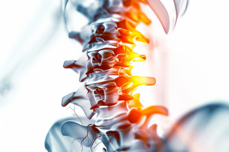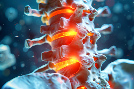 A detailed 3D illustration presents the human spinal column, highlighting the vertebrae and intervertebral discs with glowing red accents against a dark backdrop, illustrating anatomy clearly.