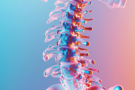 A striking portrayal of the human spine, highlighted in luminous hues. The vertebrae and discs are artfully illuminated, showing their intricate structure against a soft-focus backdrop.